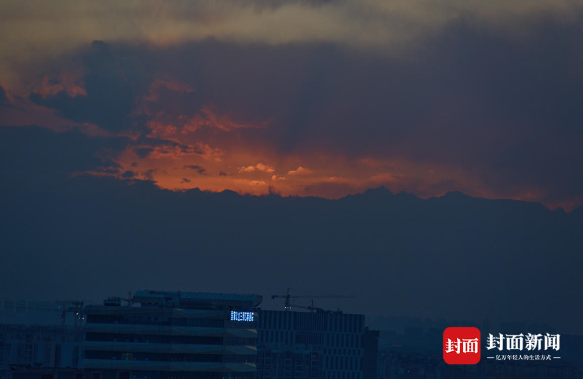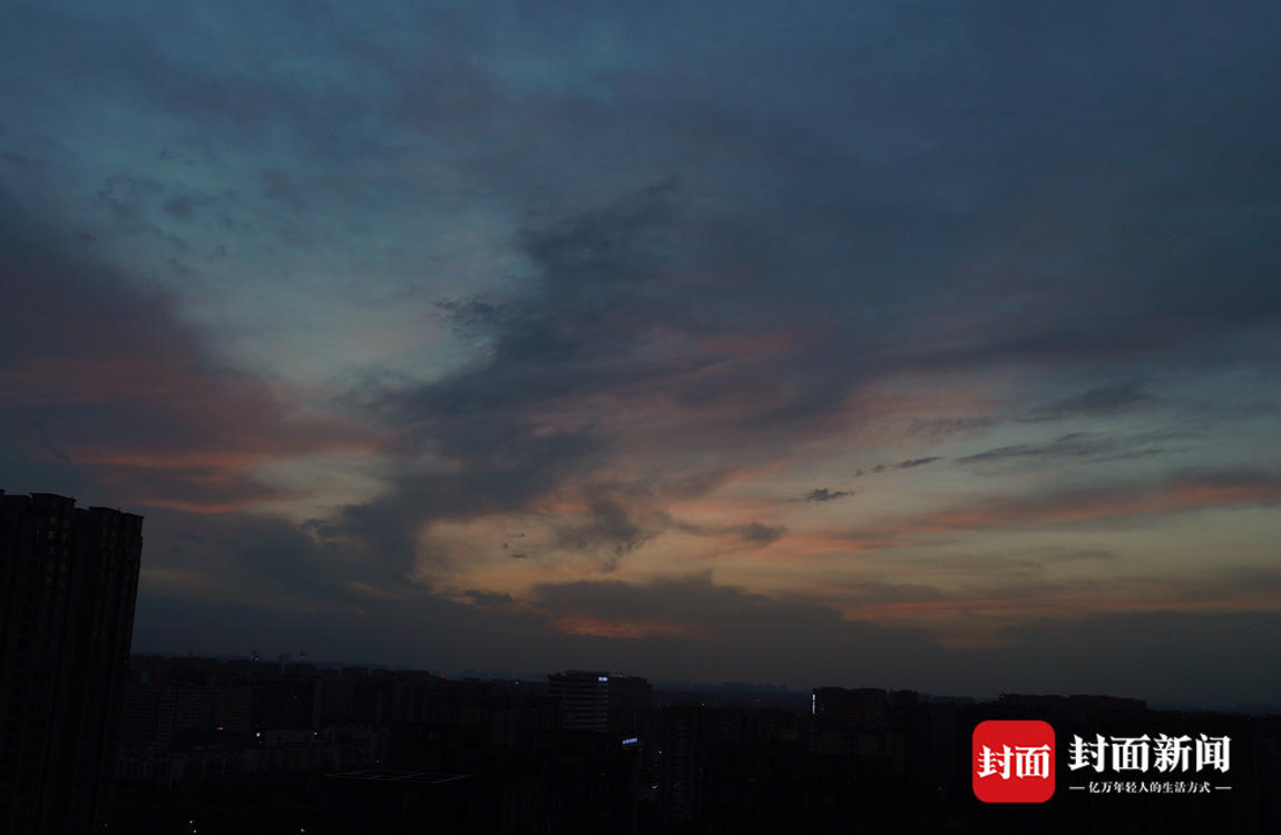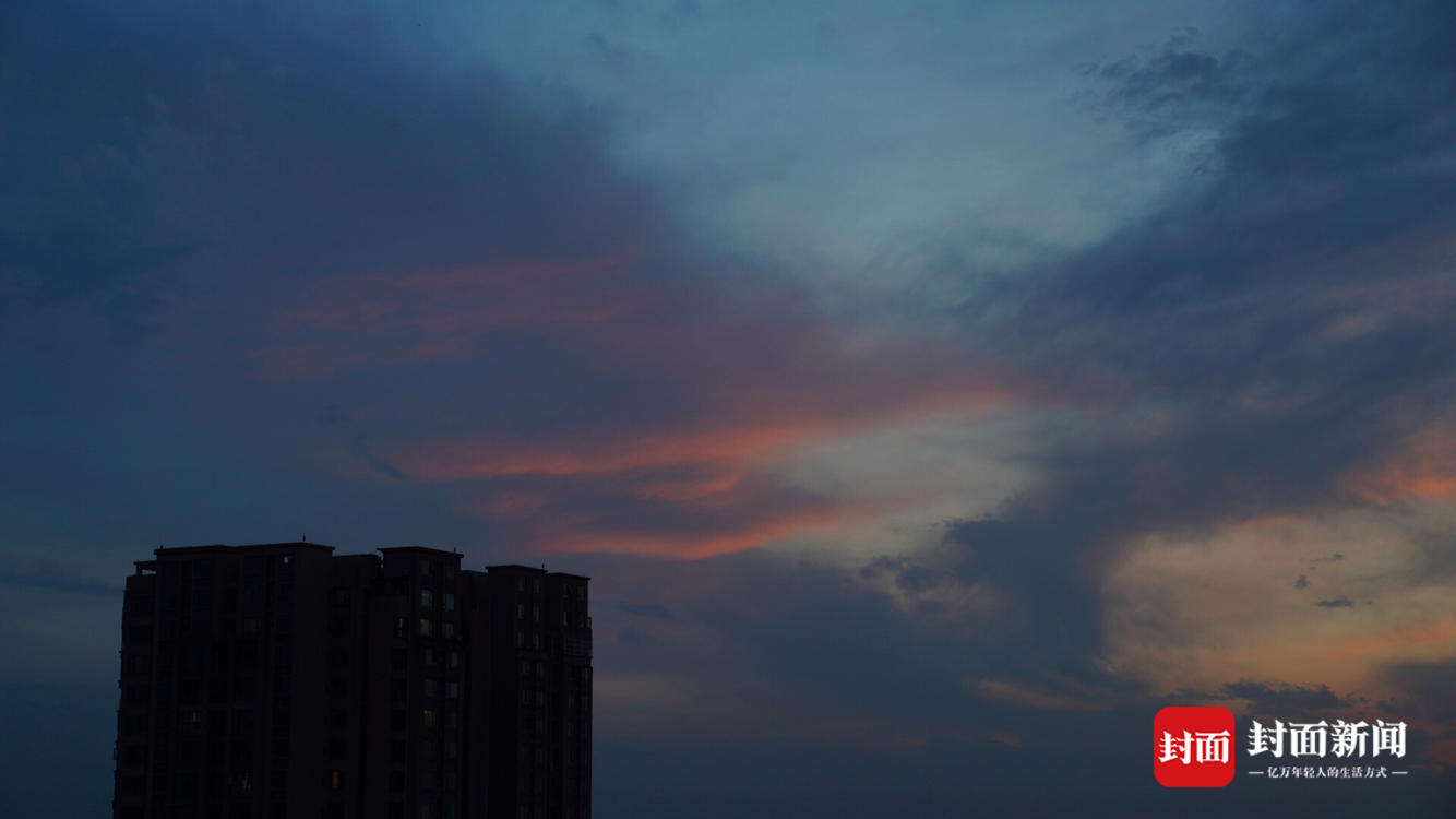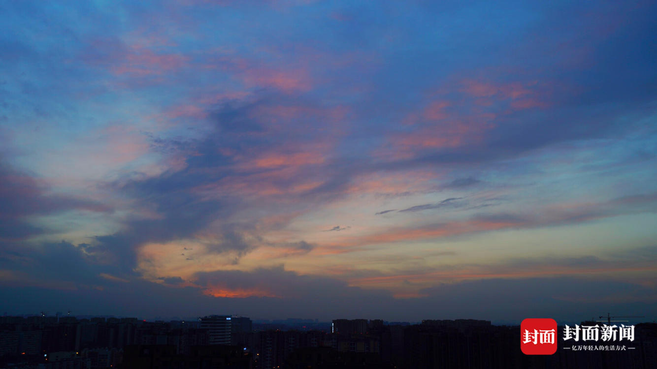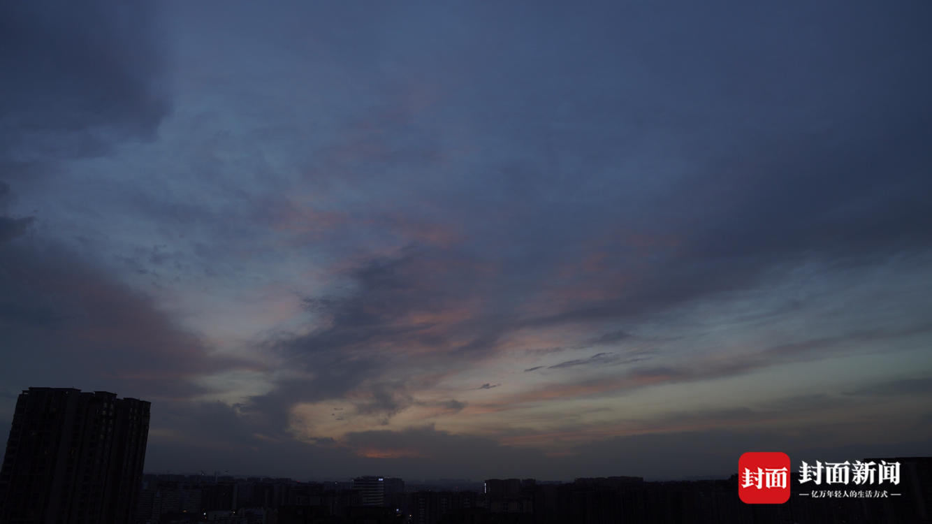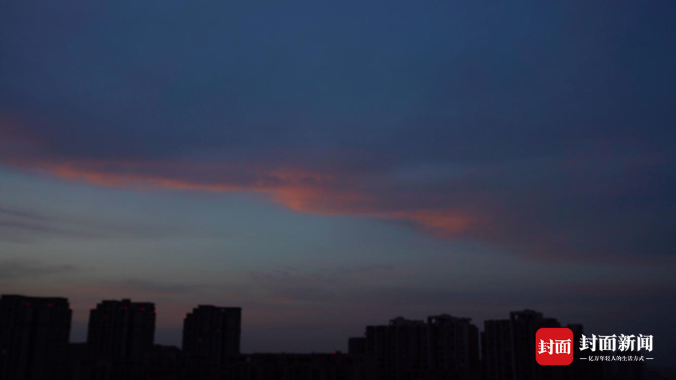 中午的一阵日晕过后,成都黄昏的天空又迎来一缕晚霞。阳光穿透云层,将云底染成金色和粉色,使天空像装上了一层粉色滤镜。