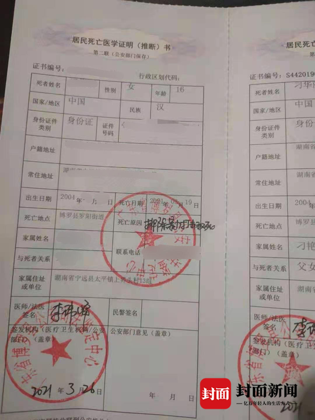 由广东省博罗县公安司法鉴定中心出具的死亡医学证明书显示,小花死亡原因“排除暴力打击致死”。同时,记者了解到,小花跳河处的东江大桥属于博罗县城郊派出所辖区,涉事酒店属于博罗县城镇派出所,而负责寻找小花遗体、进行水上搜救的则是博罗县水上派出所。4月29日上午,记者依次致电这三个派出所试图了解情况。