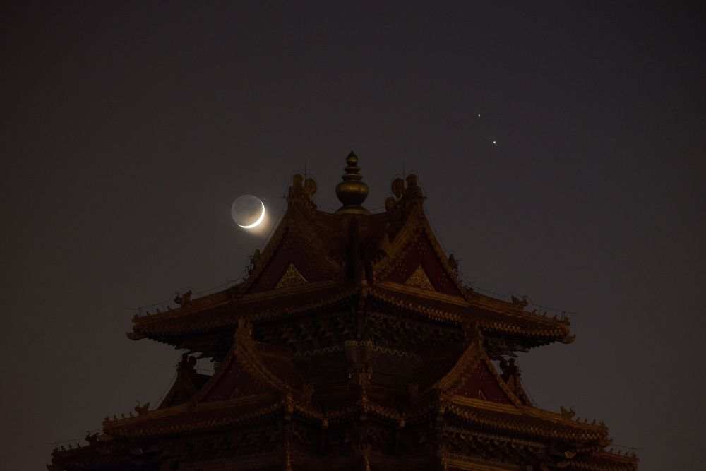 北京市天文爱好者郑志2020年12月17日在故宫角楼拍摄的“土木伴月”照片。