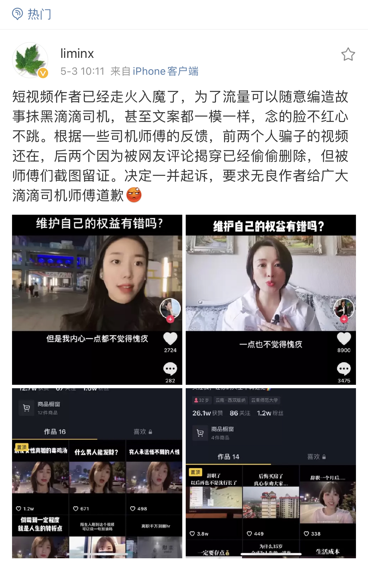 5月3日,滴滴副总裁、滴滴公益基金理事长李敏在微博表态,揭露了一些短视频博主造谣抹黑滴滴司机的行为,李敏表示决定一并起诉这些造谣的博主,要求无良作者给广大滴滴司机师傅道歉。