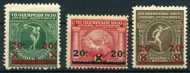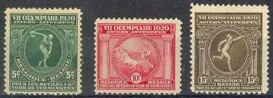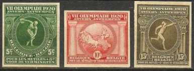 图为1920年比利时为举行奥运会发行的一套三枚纪念邮票