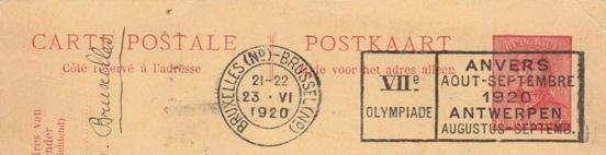 为了庆祝这届奥运会,比利时邮政部门于1920年5月20日发行了一套三枚纪念邮票,分为有齿和无齿两种版本。图案为奔跑者、马车竞技、《掷铁饼者》,面值分别为5分、10分、15分比利时法郎。由于当时比利时百废待兴,在战争中被破坏的印刷厂还没复工,这套邮票委托位于纽约的美国印钞公司印刷。