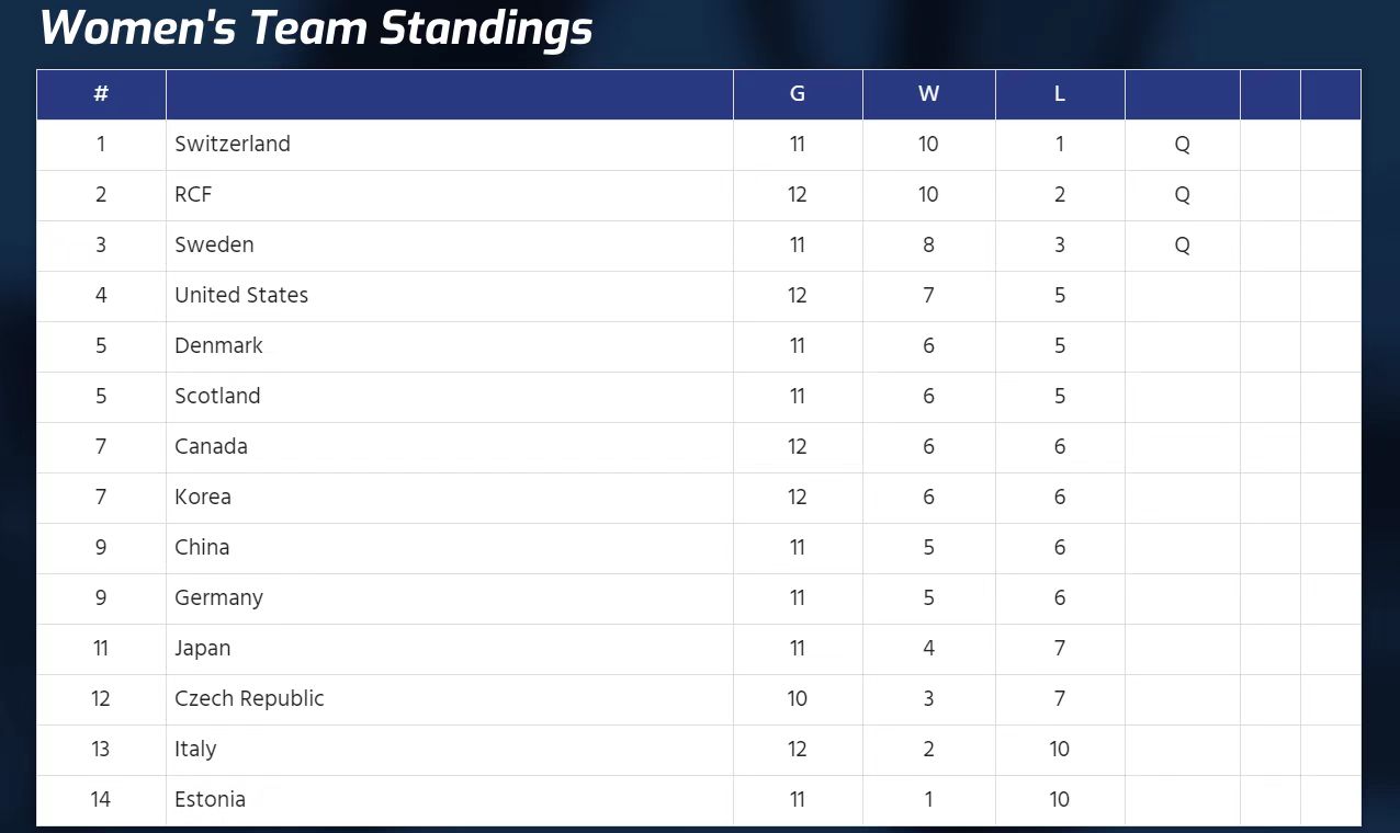 当日战罢,赛事卫冕冠军瑞士队以10胜1负的战绩取代俄罗斯冰壶协会队成为积分榜头名,2018年平昌冬奥会冠军瑞典队8胜3负排名第三,两支队伍也继俄罗斯冰壶协会队后获得2022年北京冬奥会参赛席位。