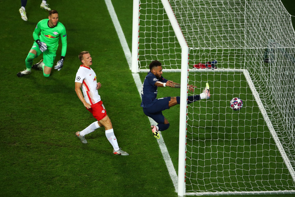 资料图:2020年8月18日,巴黎圣日耳曼队球员内马尔(右)在球队攻入第三粒进球时冲入对方球门,带领球队闯进欧冠决赛。新华社发(欧足联供图)