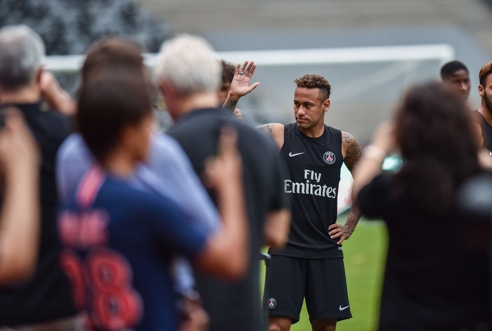 资料图:8月3日,巴黎圣日耳曼队球员内马尔(中)向球迷致意。新华社记者毛思倩摄