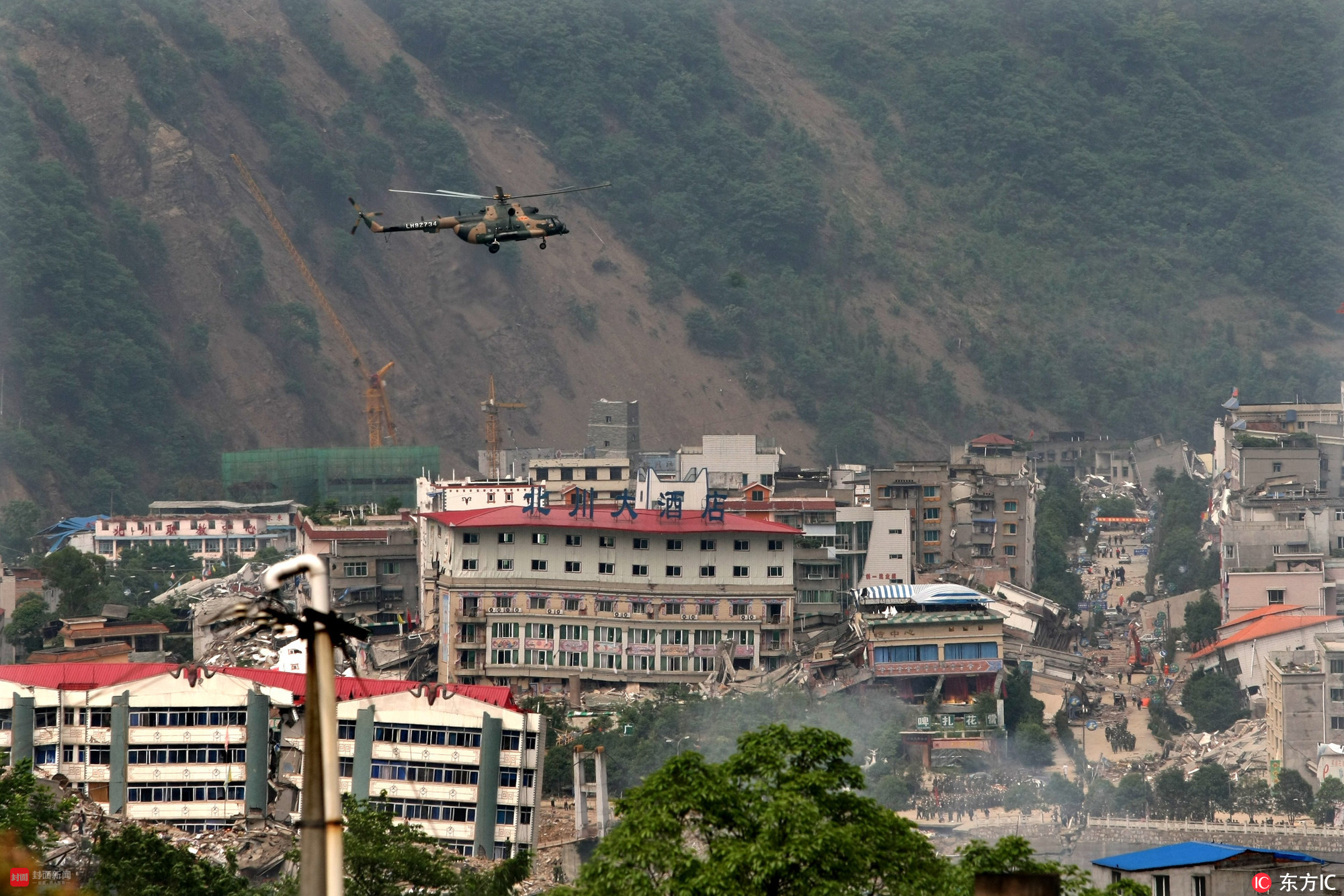 2008年5月15日下午3时许,英雄飞行员邱光华机组驾驶的92734号直升机强降北川县城,在废墟中实施抢险救援任务。
