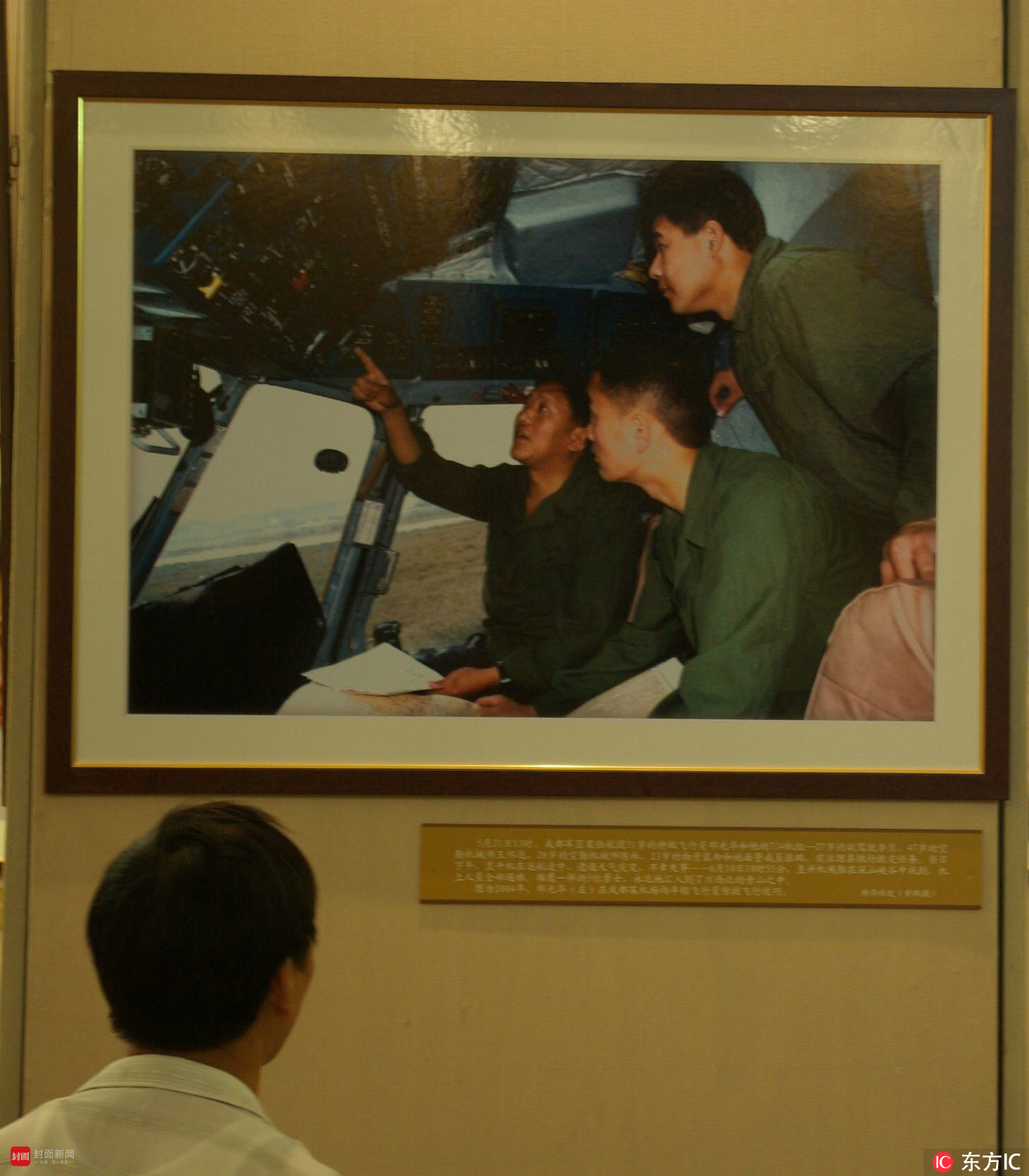 2008年6月12日,北京举行的“抗震救灾众志成城——2008中国抗震救灾大型新闻图片展”上,一位参观者在失事的邱光华机组照片前久久观看,缅怀救灾殉难官兵。