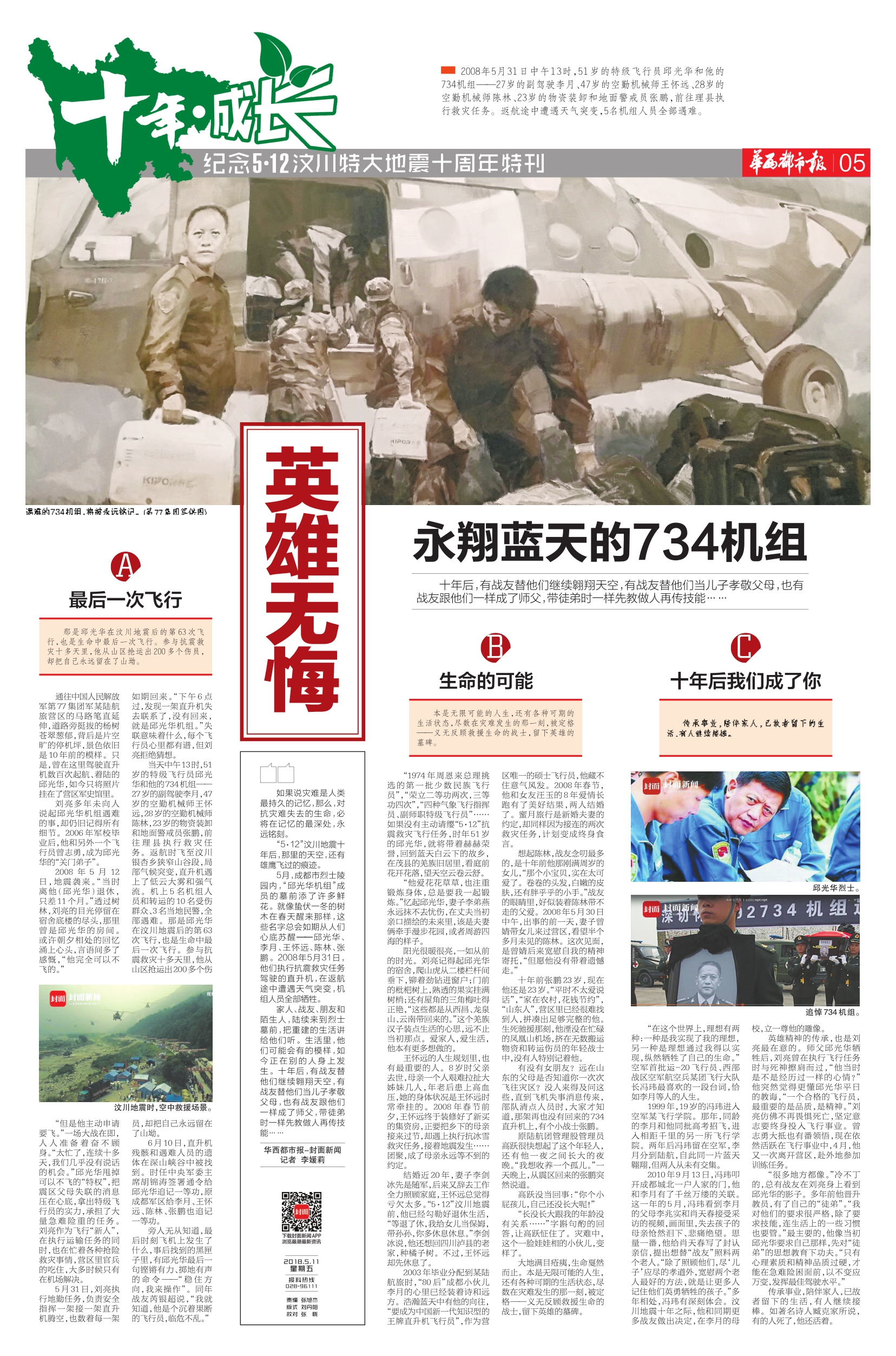 5月,成都市烈士陵园内,“邱光华机组”成员的墓前添了许多鲜花。就像蛰伏一冬的树木在春天醒来那样,这些名字总会如期从人们心底苏醒——邱光华、李月、王怀远、陈林、张鹏。2008年5月31日,他们执行抗震救灾任务驾驶的直升机,在返航途中遭遇天气突变,机上人员全部牺牲。