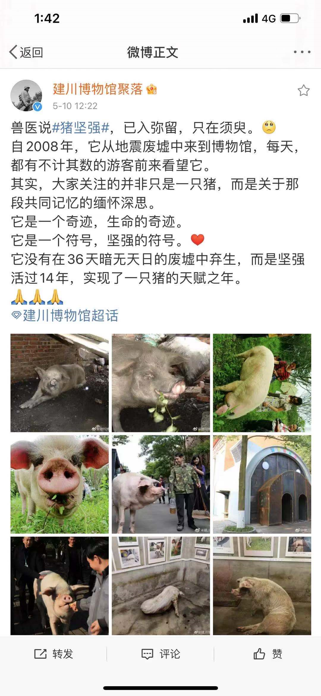 5月10日,建川博物馆聚落官方发声,称兽医说猪坚强已入弥留,只在须臾。