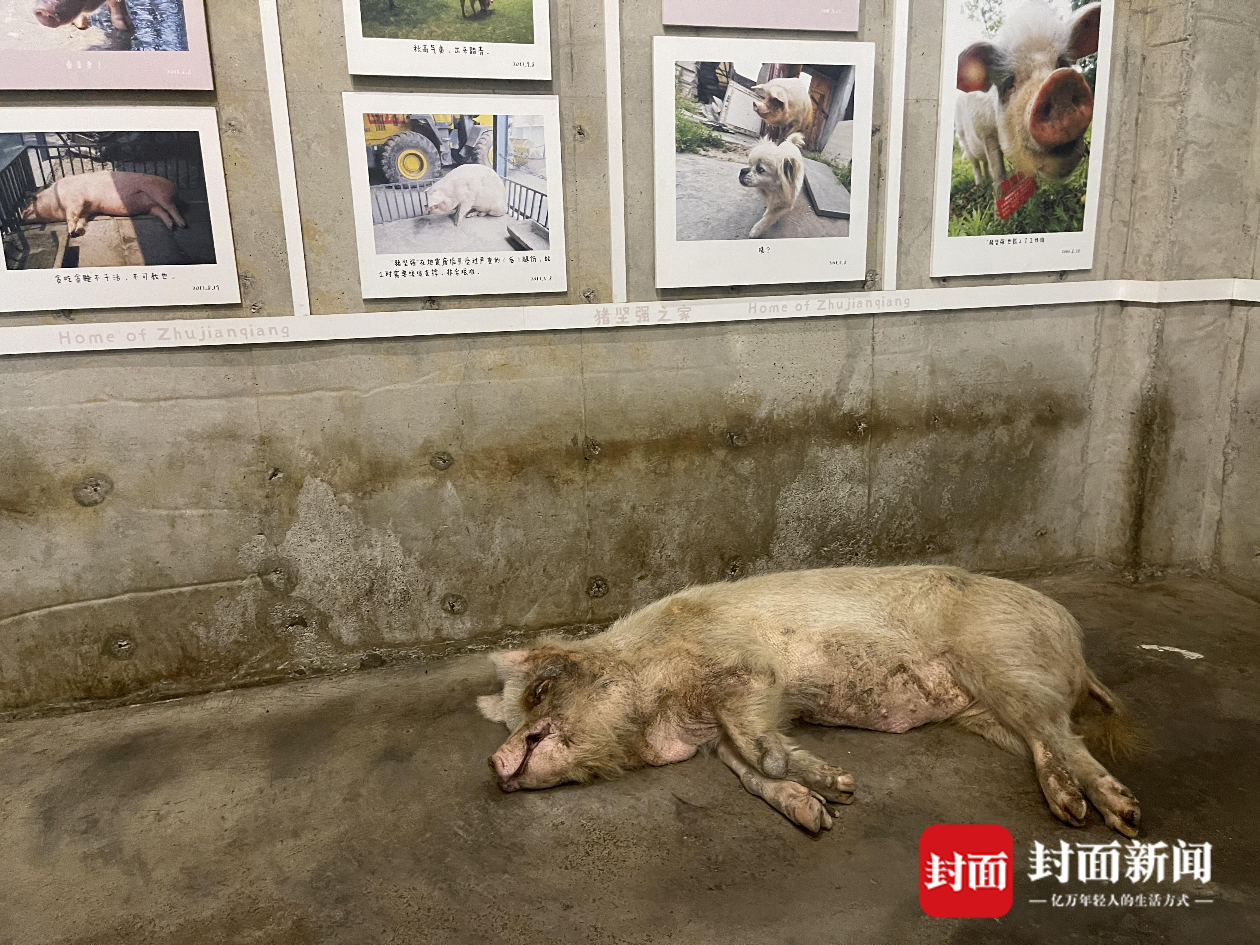 一波波游客从各地赶来看望它。于女士一家是成都人,今天和朋友一家来到建川博物馆。“它现在年纪太大了,相当于人的一百岁了,活到现在不容易。”她说,猪坚强象征着一种“不抛弃,不放弃”的精神,博物馆将其养护在这里,很有意义。