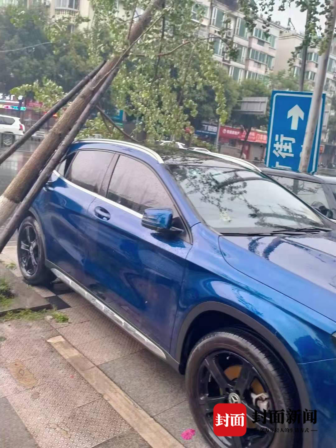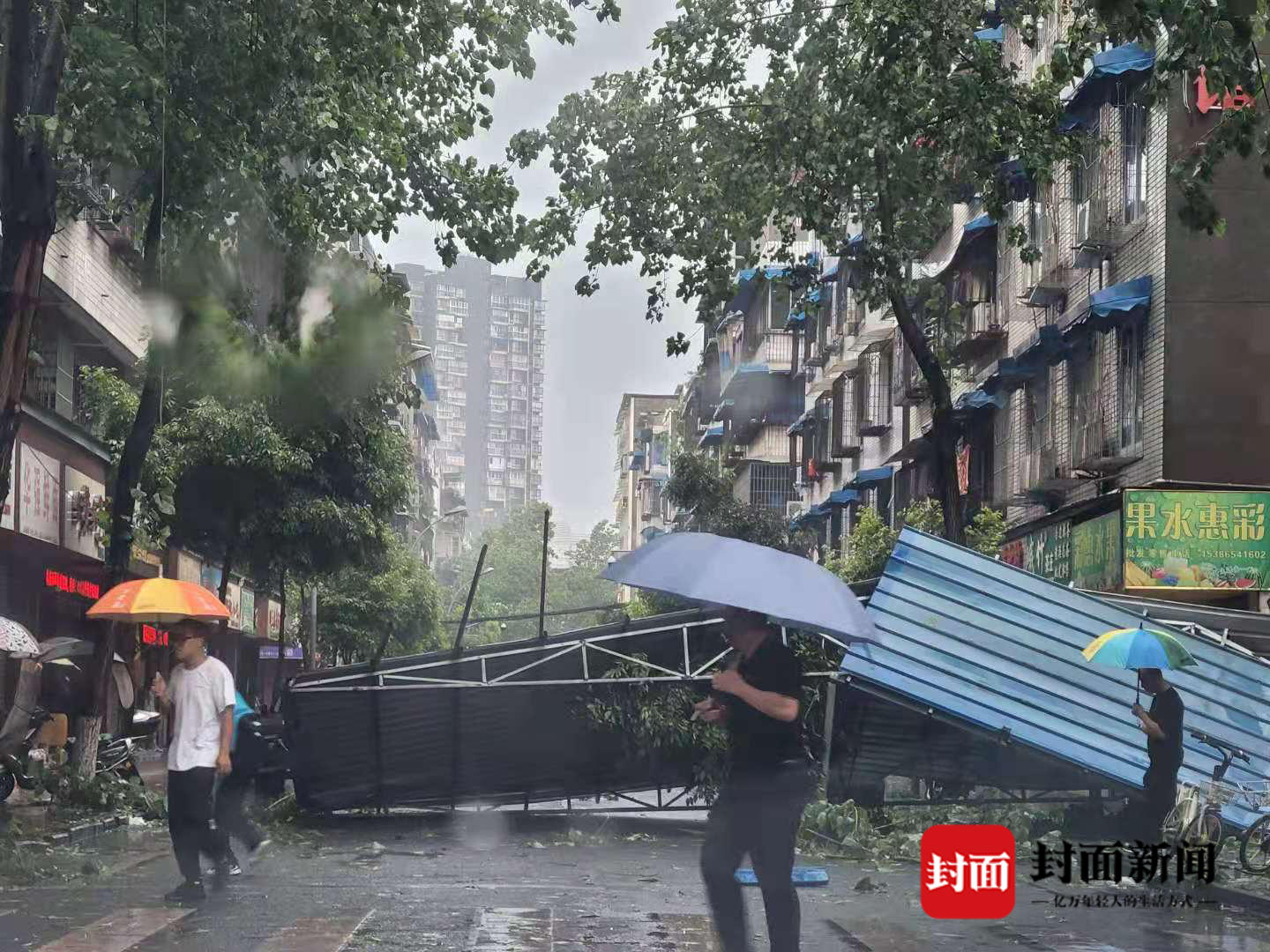 乐山主城区春华路,肖坝路、柏杨路、龙游路、鹤翔路等多条主干道路,部分路段出现积水。持续近1个小时的狂风骤雨,使得人行道上的行道树倒伏,砸中路边停放的私家车,大风将农民街一钢架棚掀起,倒在了路中间。