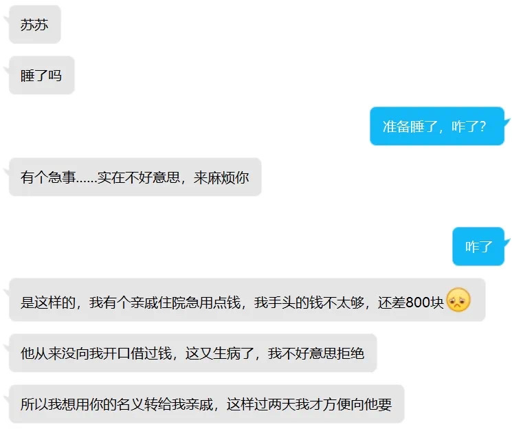 “苏苏,我有点急事找你帮忙!”3月6日凌晨,四川某职业学院学生小王接到“同班同学”的QQ消息,对方称自己有个亲戚住院急用点钱,“还差800块,我手头的钱不太够,亲戚从来没向我开口借过钱,我不好意思拒绝,所以我想用你的名义转给我亲戚,这样过两天我才方便问他要回。”