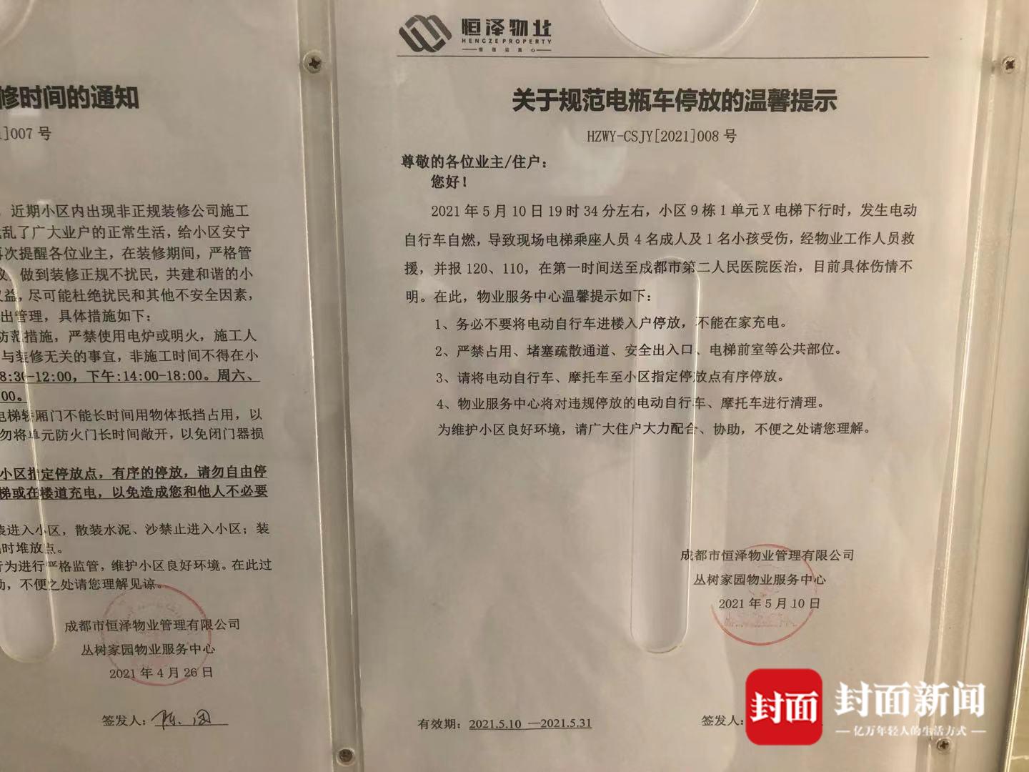因此,业主们才会对电瓶车停在哪里、停放区什么时候能开、收费标准是否合理产生了质疑,这也指向了爆燃事故的焦点——它背后是一个“无人监管”的盲区。而就在5月11日,成都市物业管理协会发布了《关于进一步加强物业服务区域电动车停放充电管理的紧急通知》,通知表示对在共用走道、楼梯间、安全出口处等公共区域停放电动车或者为电动车充电的行为予以坚决制止并组织清理。