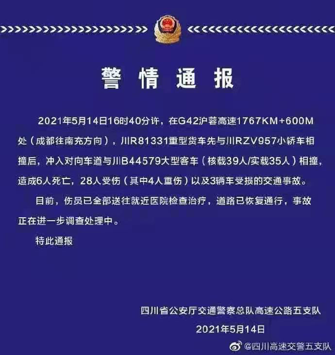 据四川省公安厅交通警察总队高速公路五支队通报,5月14日16时40分许,在G42沪蓉高速1767KM+600M处(成都往南充方向),川R81331重型货车先与川RZV957小轿车相撞后,冲入对向车道与川B44579大型客车相撞,造成6人死亡,28人受伤(其中4人重伤)以及3辆车受损的交通事故。