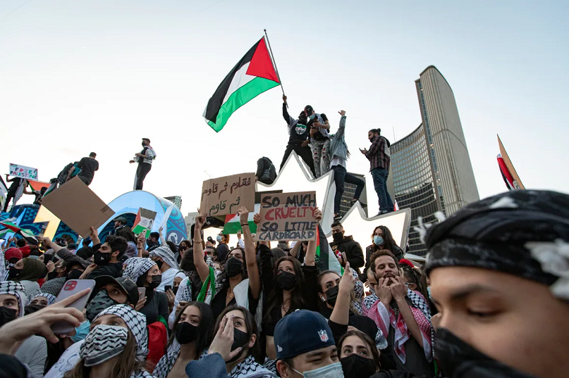 当地时间5月15日下午,加拿大多地爆发了声援巴勒斯坦人的示威活动。尽管这些地方目前依然在实行严格的防疫措施,禁止举行超过5人的室外聚会,仍有大量的示威者走上街头。示威者呼吁尊重巴勒斯坦人的人权,结束以色列对巴勒斯坦的占领。