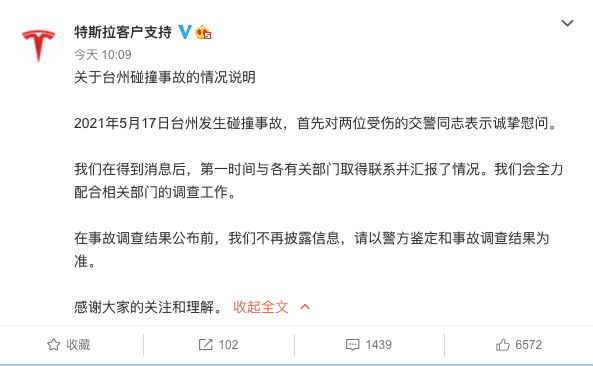 5月18日上午,特斯拉方面发布情况说明,对两位受伤的交通警务人员同志表示诚挚慰问。并称特斯拉在得到消息后,第一时间与各有关部门取得联系并汇报了情况,会全力配合相关部门的调查工作。在事故调查结果公布前,特斯拉不再披露信息,请以警方鉴定和事故调查结果为准。感谢大家的关注和理解。