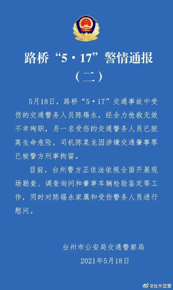 据浙江台州交警5月18日下午通报,5月17日,发生在螺洋街道104西复线高架桥的特斯拉碰撞两交警车祸,至5月18日,受伤交通警务人员陈某永,经全力抢救无效不幸殉职;另一名受伤的交通警务人员已脱离生命危险。司机陈某龙因涉嫌交通肇事罪已被警方刑事拘留。