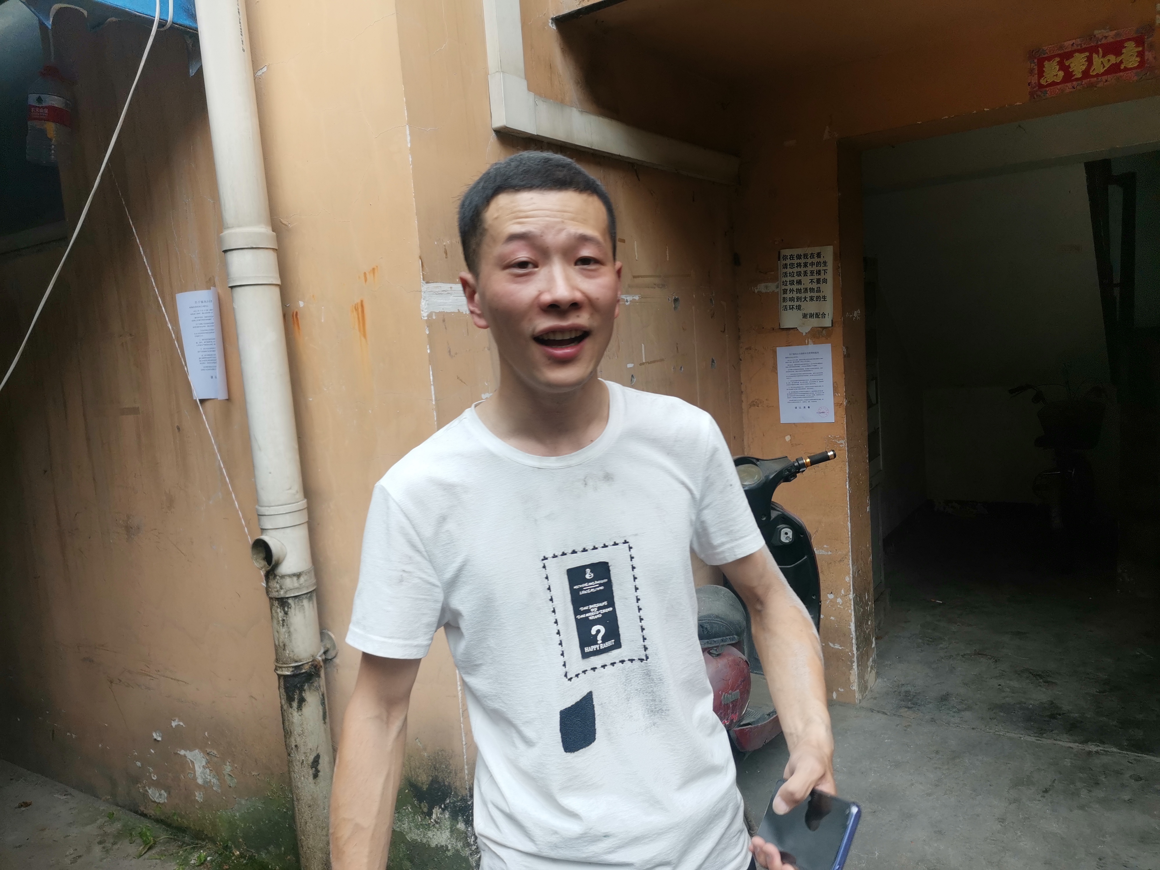 黄毅是一名退伍军人,在部队服役和交警二分局工作期间接受过消防培训,他一边让小区保安拨打119火警电话,一边往着火的单元跑去。到了着火的住户门口,黄毅使劲的拍打大门,不停地大喊“有没有人在家”。不一会,一名仅着内裤的男子听到声音后打开门跑出。此时,着火的住户家中弥漫着呛人的浓烟,火舌四窜。