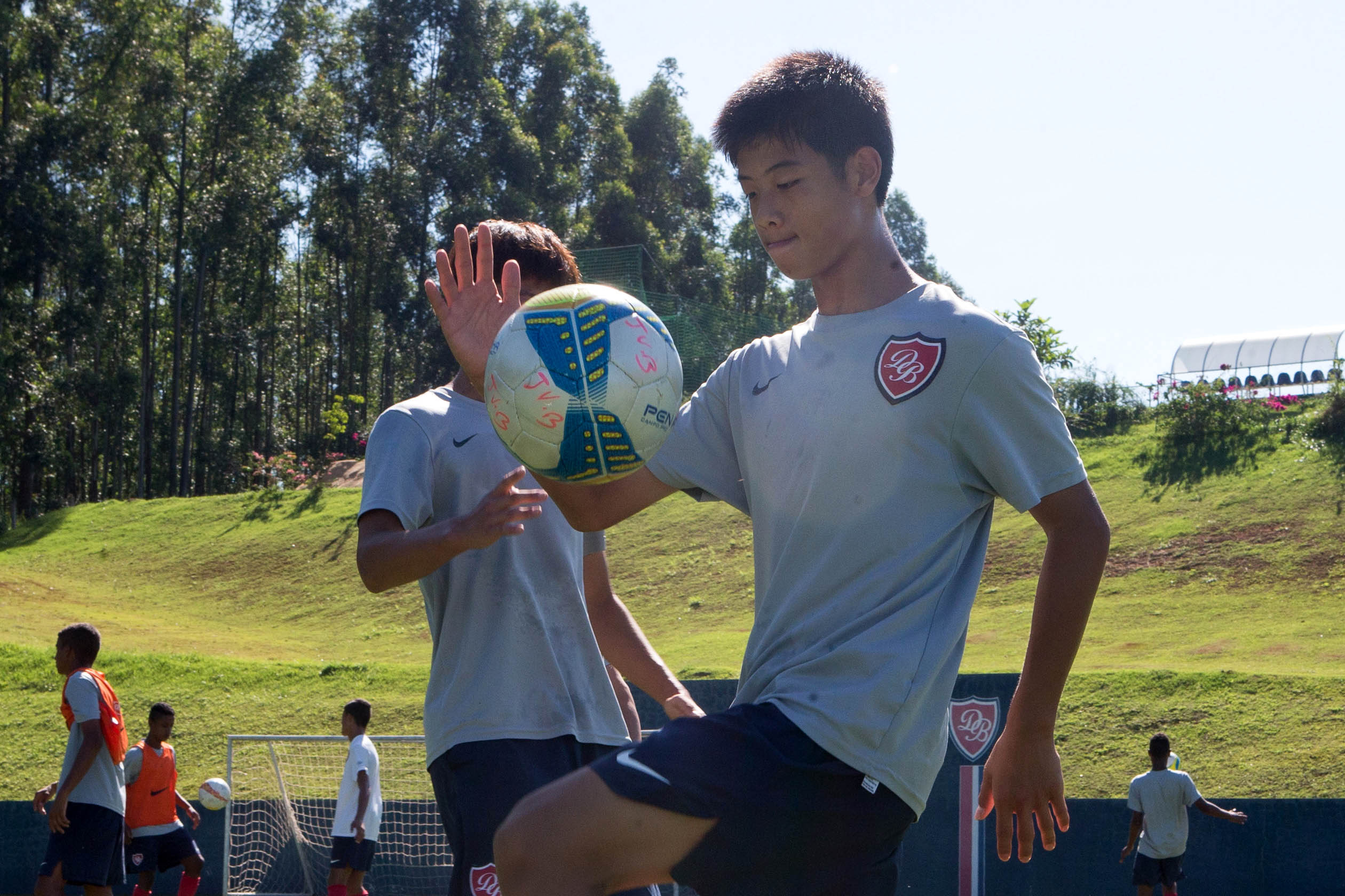 图为2015年3月,来自鲁能足校的小球员田鑫(右)在山东鲁能巴西体育中心训练中。新华社记者徐子鉴摄