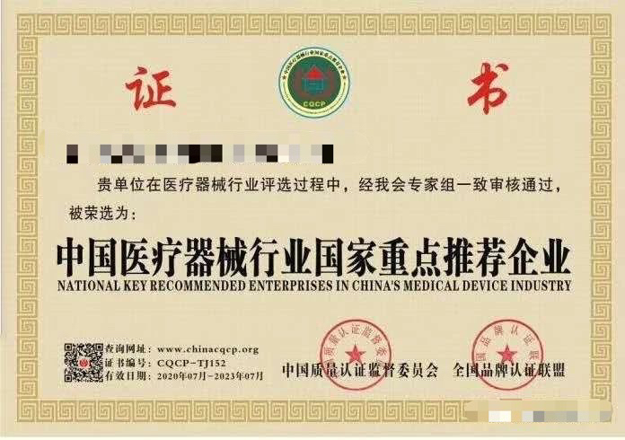 某医疗器械行业公司获得“中国质量认证监督委员会”认证“中国医疗器械行业国家重点推荐企业”。网络资料