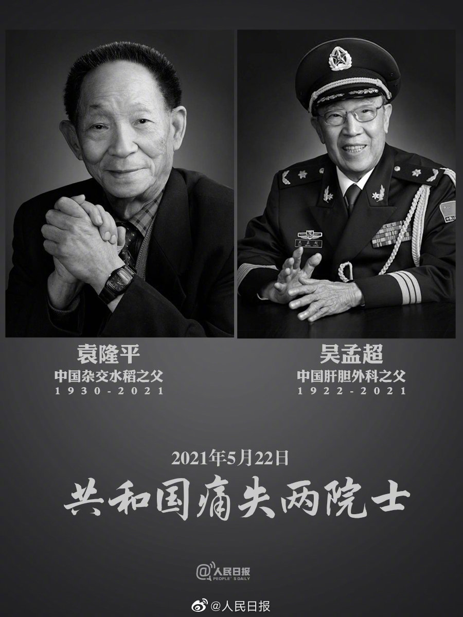 双星陨落!共和国一天痛失两位院士 @人民日报 2021-05-22 19:27 39137 5月22日13时02分,“中国肝胆外科之父”吴孟超逝世,享年99岁。5月22日13时07分,“杂交水稻之父”袁隆平逝世,享年91岁。国士无双,#愿世间如你们所愿医食无忧#,送别! 评论 1 屋顶榭寄生 2021-05-22 双星陨落 我要评论