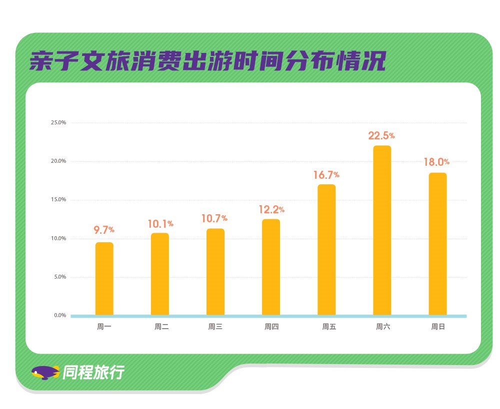 值得关注的是,博物馆/科技馆的需求在疫情形势稳定后呈现坚定向上趋势,这一主题高度契合亲子游消费者对于“开阔视野”与趣味性的诉求。在具体出游时间方面,周末(周六及周日两天)是亲子文旅消费较为集中的时段,在一周客流量中的合并占比达到了40.5%。