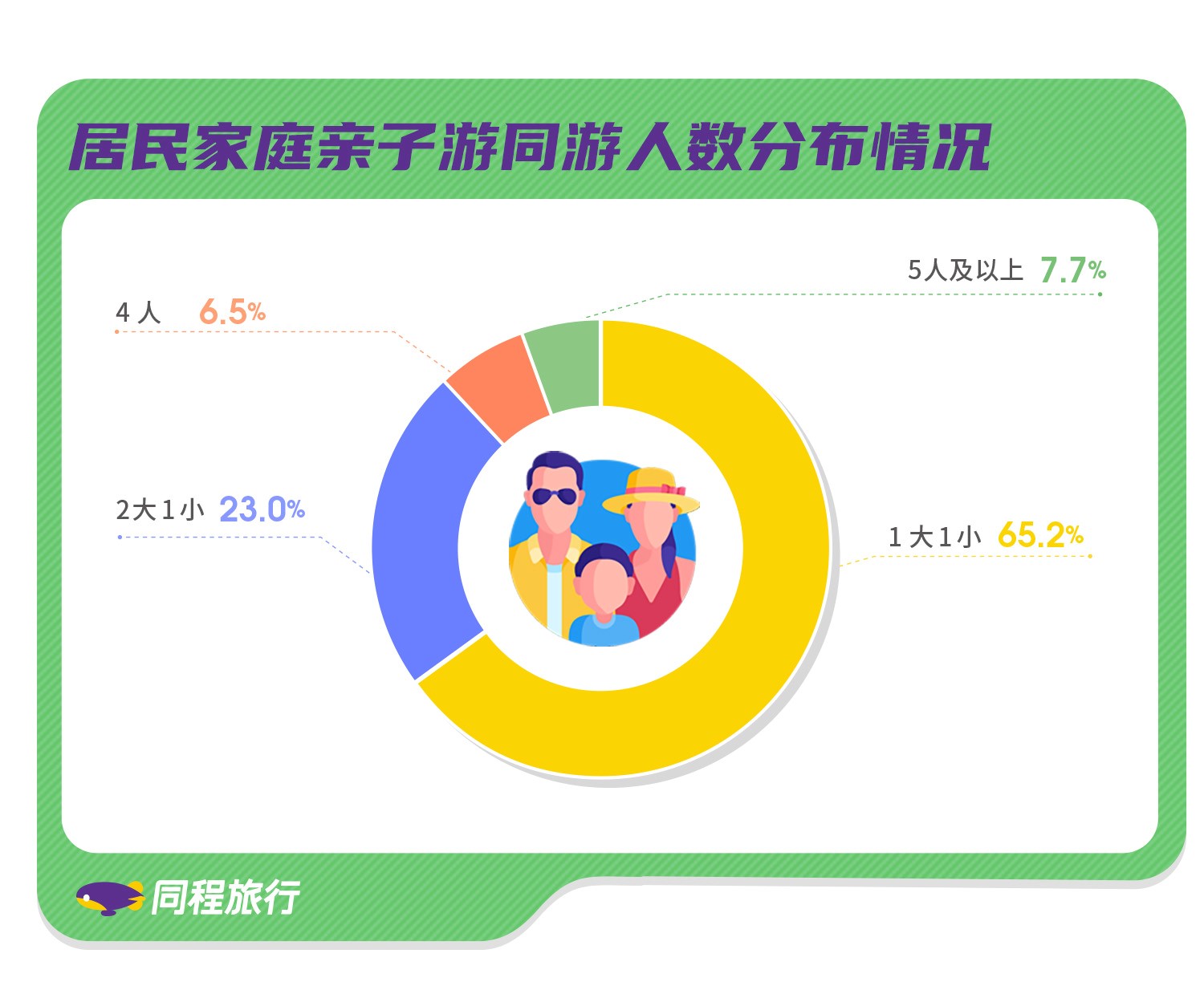 通常情况下“一大一小”或“两大一小”(父母加一个12岁以下的孩子)是亲子游的标准出游形式,但随着二胎家庭的增多,出现了“2+1+X”或“2+2+X”的新模式,即“父母+1个孩子+爷爷奶奶或外公外婆”,以及“父母+2个孩子+爷爷奶奶或外公外婆”,呈现出举家出游的新形态。数据显示,“1大1小”出游仍是主流,占比65.2%,“2大1小”出游占比23%,多人同游合并占比11.8%,首次超过10%。