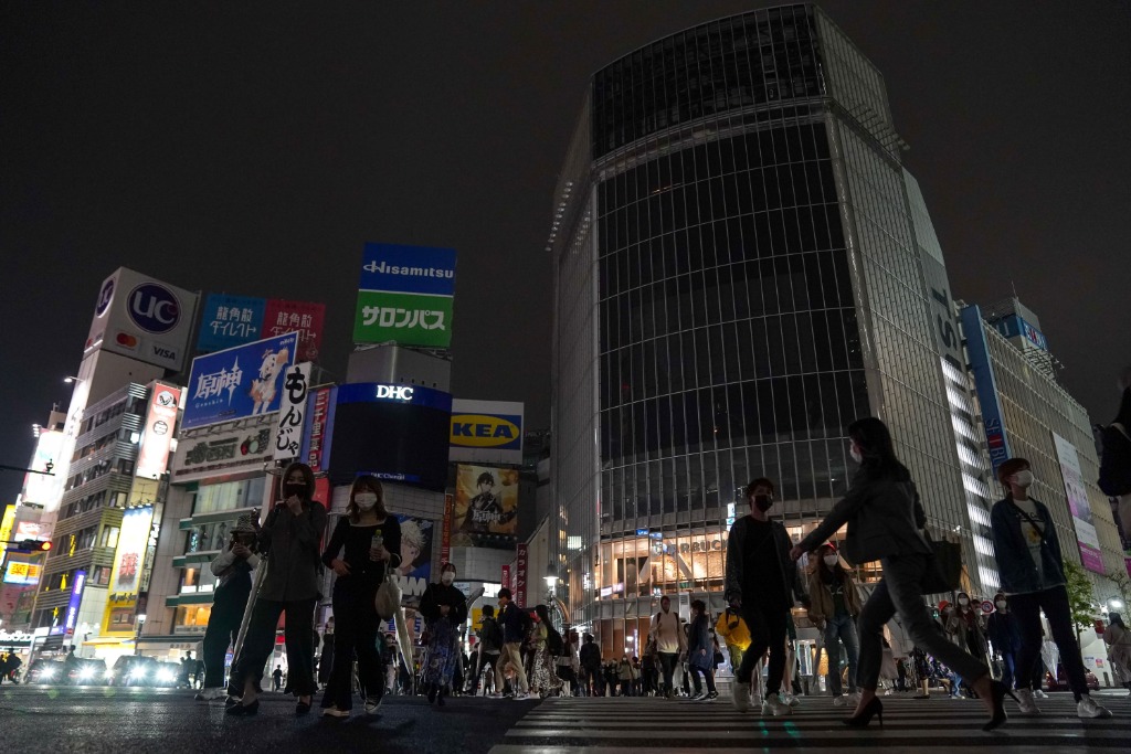 5月7日,日本东京涩谷街头夜晚“熄灯”,呼吁人们减少夜间出行娱乐。(新华社发,克里斯托弗·朱摄)