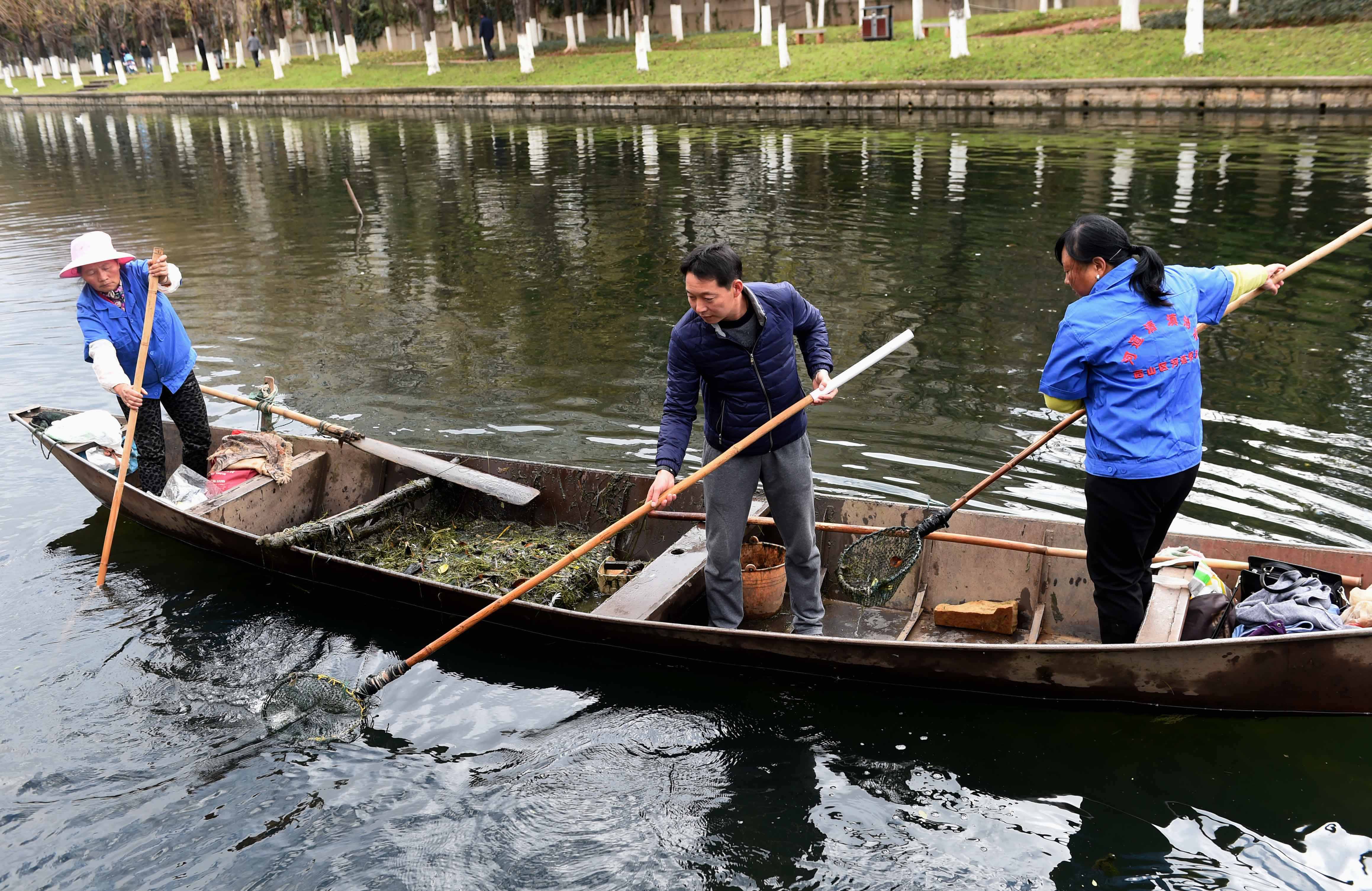 这是云南省昆明市福海街道办新河社区的河长和工作人员在流入滇池的船房河上打捞垃圾和杂物(2017年1月6日摄)。 新华社记者 蔺以光 摄