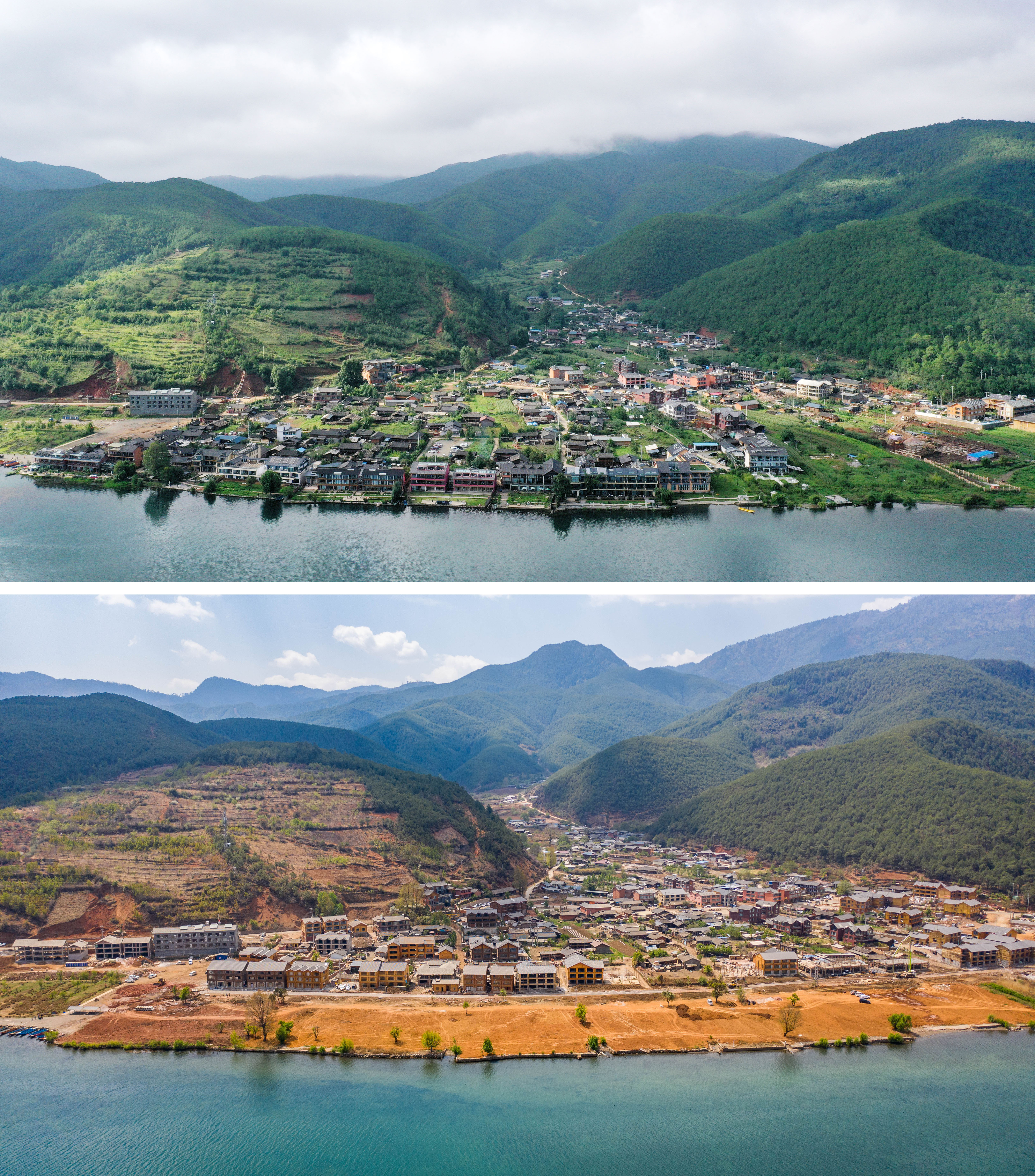 拼版照片,上图:这是2019年8月11日拍摄的云南省丽江市宁蒗县永宁镇蒗放村一景(资料照片);下图:2021年4月17日拍摄的云南省丽江市宁蒗县永宁镇蒗放村80米生态红线内民居客栈退出拆迁工程一景,目前项目处于生态修复阶段。 新华社记者 胡超 摄
