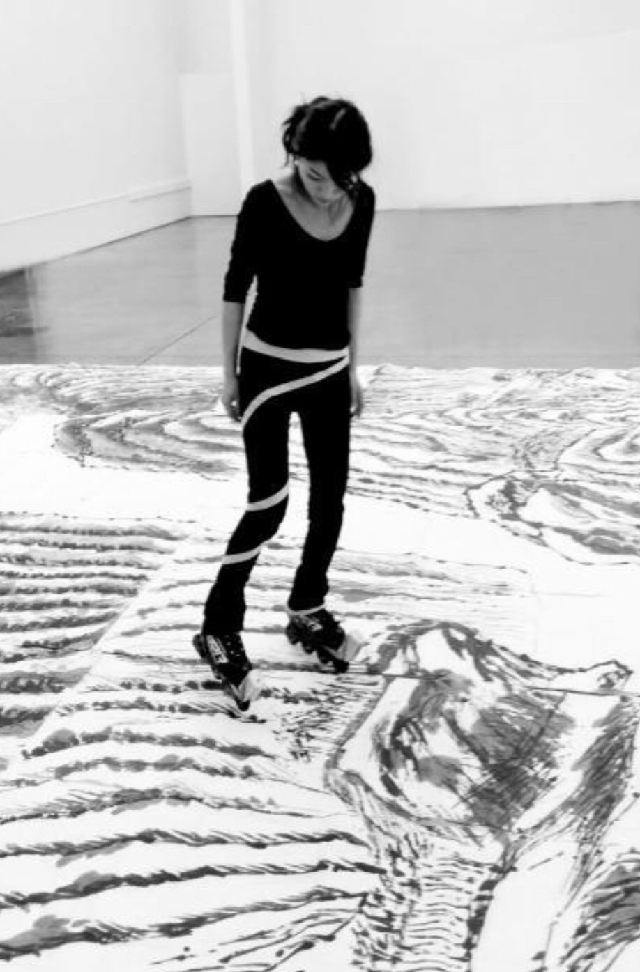在完成作品的过程中,首先要面临的难点是技术上的创新。“我需要反复尝试如何既使用轮滑绘画这种全新的形式,又保留中国传统水墨画中勾皴点染的技法来体现传承。”她设计了一个特殊的墨盒置于轮滑鞋前端,其中的墨汁能够缓慢、不间断地滴落在轮子上。她通过停顿和跳跃来制造对比效果,用脚尖点地来描绘纹理,通过前后移动滑轮加强线条。