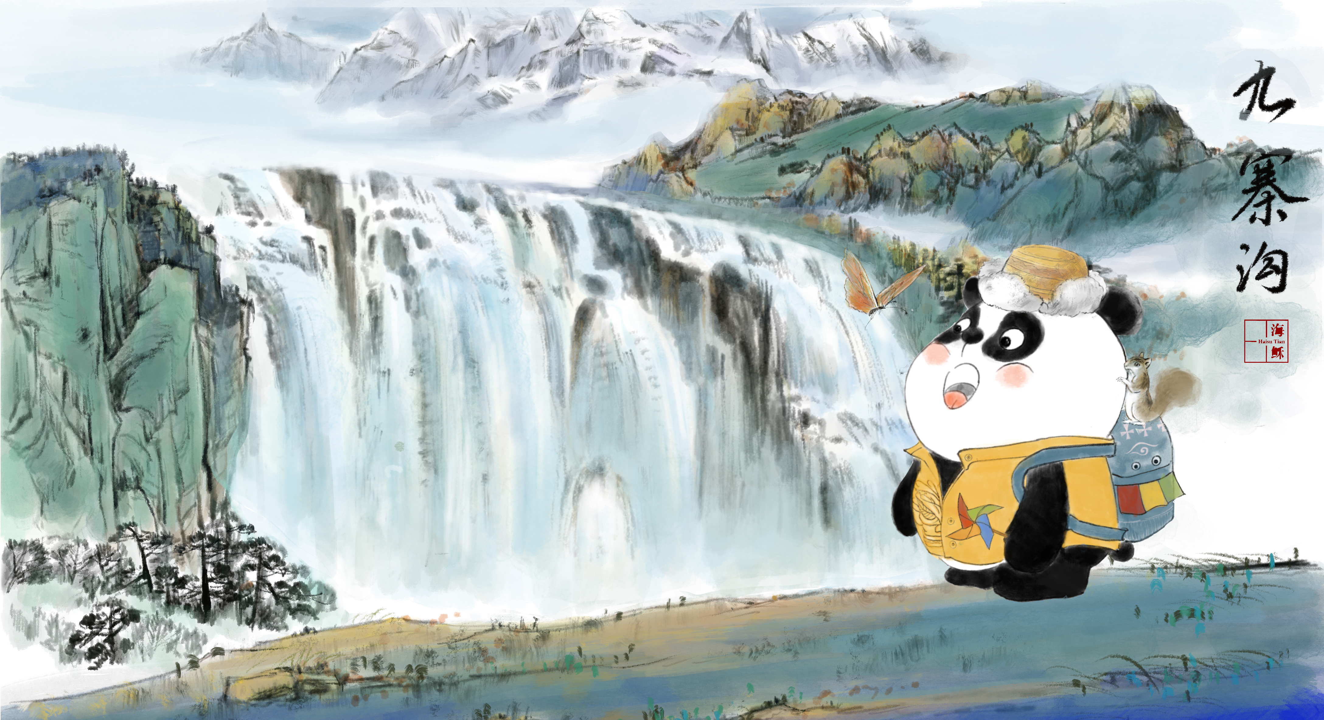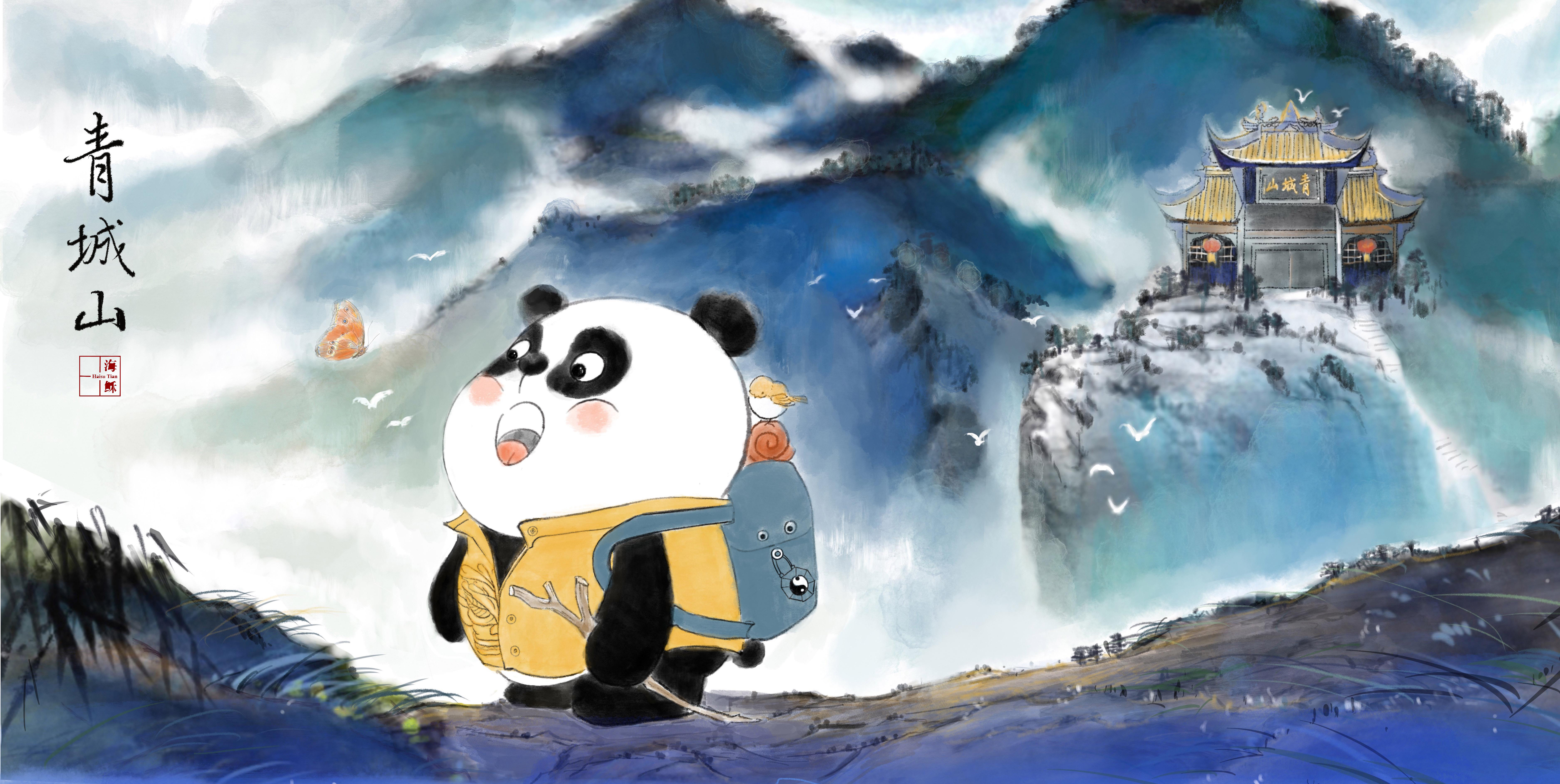 每一幅画中,海稣结合具体旅行地点,添加了当地的文化元素。比如在乐山大佛,熊猫身后的鸭子寓意乐山特色名吃甜皮鸭;在三星堆,熊猫带上了黄金面具,手里还拿着三星堆的文创雪糕;在九寨沟,熊猫带上了当地特色的帽子;在青城山,它的书包挂着象征道教文化的“八卦”配饰;在峨眉山,熊猫手里握着一只峨眉山的高山杜鹃,肩上多了一只在这里栖息的金丝猴……“只有深入了解当地的历史、文化、特色,才能从中得到大量的创作灵感。”海稣说,只有这样每张图的点线面无论在技术层面、内容层面还是概念层面,才能得到统一,才能是一个有机的整体。