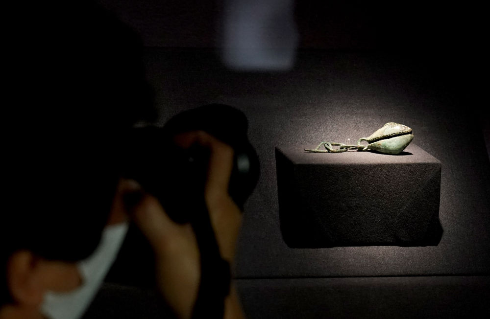 ↑6月7日,一名媒体记者在上海奉贤博物馆展厅拍摄四川广汉三星堆博物馆藏文物“铜扇贝形挂饰”。