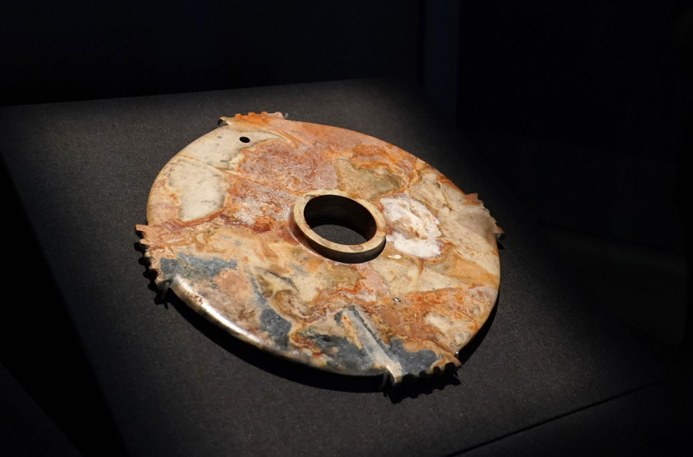 ↑6月7日在奉贤博物馆展厅拍摄的四川成都金沙遗址博物馆藏文物“有领玉牙壁”。