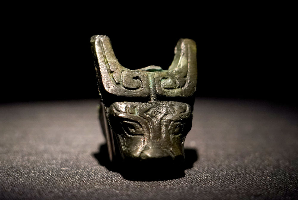 ↑6月7日在奉贤博物馆展厅拍摄的四川成都金沙遗址博物馆藏文物“铜牛首”。