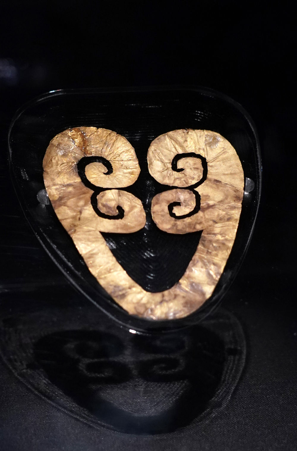 ↑6月7日在奉贤博物馆展厅拍摄的四川成都金沙遗址博物馆藏文物“金人面像”。