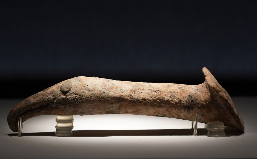 ↑6月7日在奉贤博物馆展厅拍摄的四川广汉三星堆博物馆藏文物“陶鸟头勺把”。