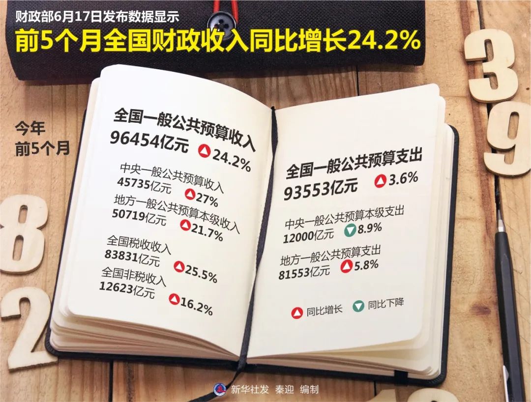 财政部发布数据显示,今年前5个月,全国一般公共预算收入96454亿元,同比增长24.2%。