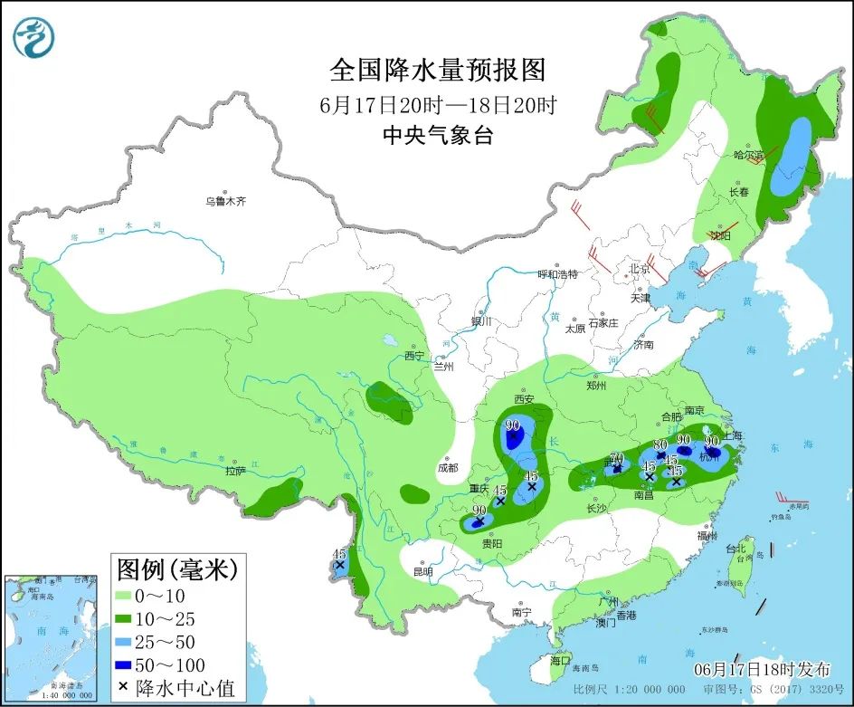6月17日20时至18日20时,内蒙古东北部、东北地区东部、陕西南部、四川盆地东部、重庆东部、贵州北部、湖北西部和东部、苏皖南部、江南北部等地部分地区有中到大雨,其中,安徽南部、湖北东部、浙江北部、四川盆地东北部、贵州西北部等地部分地区有暴雨。