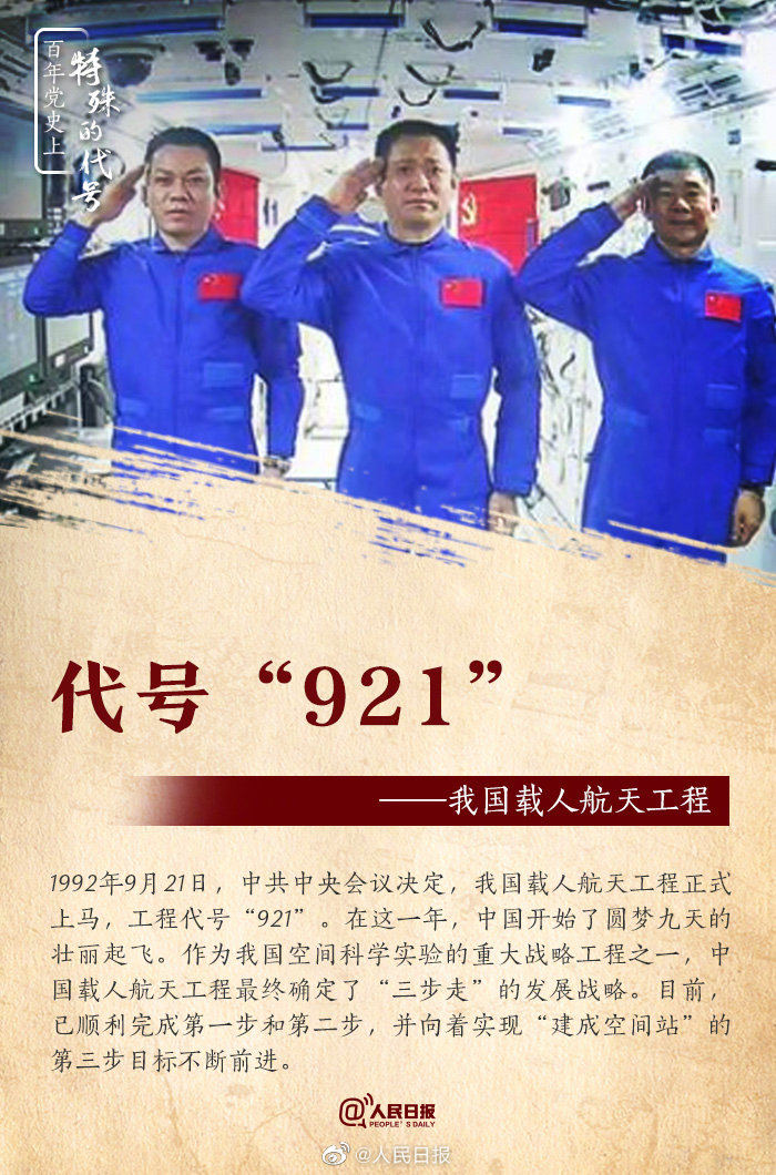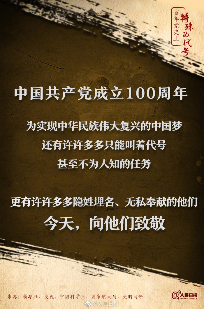 中国首款导弹“东风一号”代号“1059”、中国首颗原子弹代号邱小姐、我国载人航天工程代号“921”……这些特殊的代号凝结着无数人的心血和付出。中国共产党100周年,还有许多只能叫着代号、甚至不为人知的任务,更有许许多多隐姓埋名的他们。今天,向他们致敬!