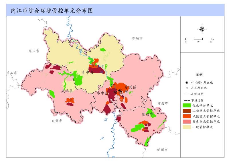 作为《通知》附件的《内江市综合环境管控单元分布图》,用不同的颜色标明了内江各县(市)区内管控情况。优先保护单元9个、重点管控单元23个、一般管控单元2个。“这张图今后将成为地方产业布局、环境管控的一个工具图。”蔡虎城说。