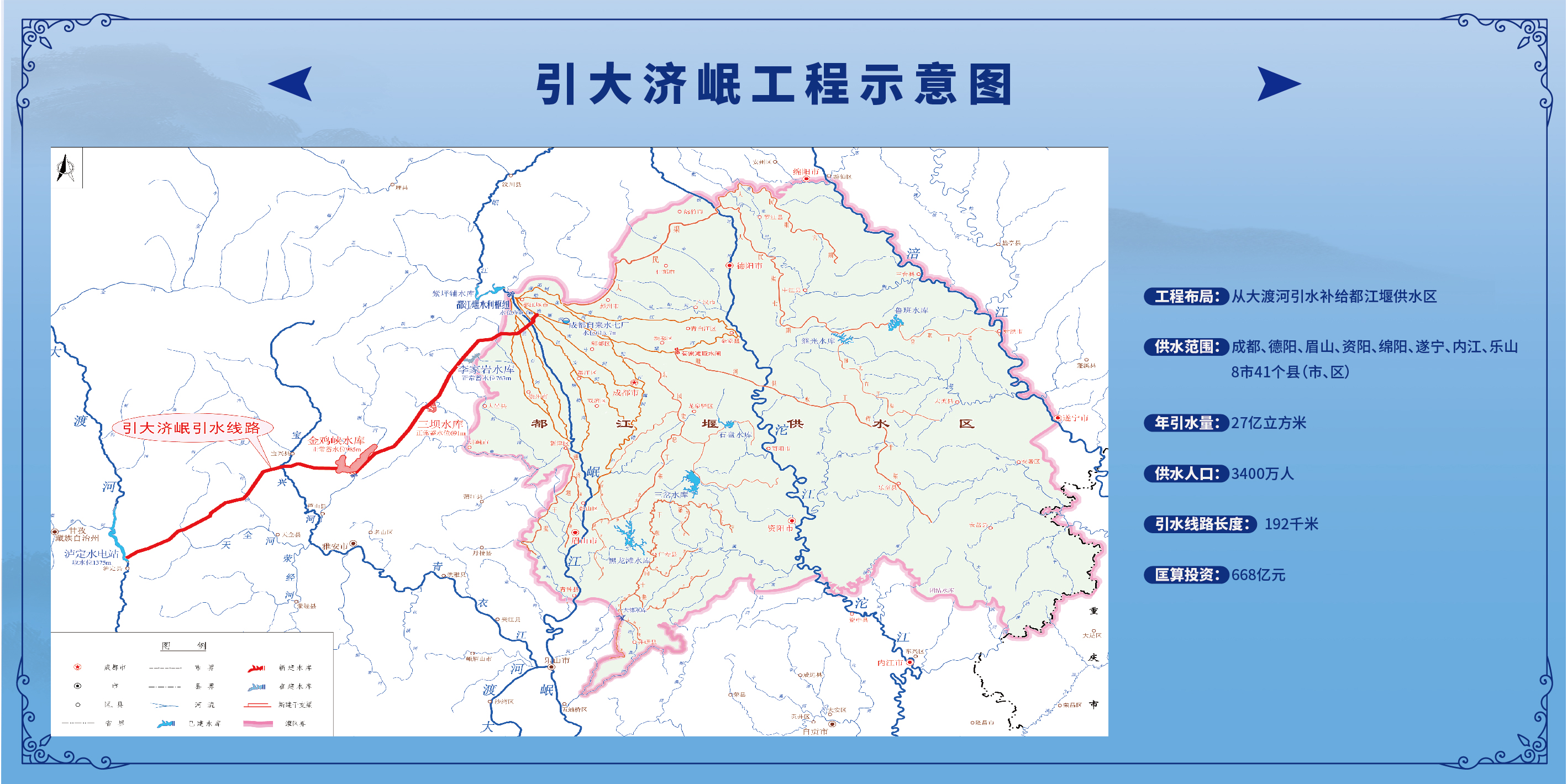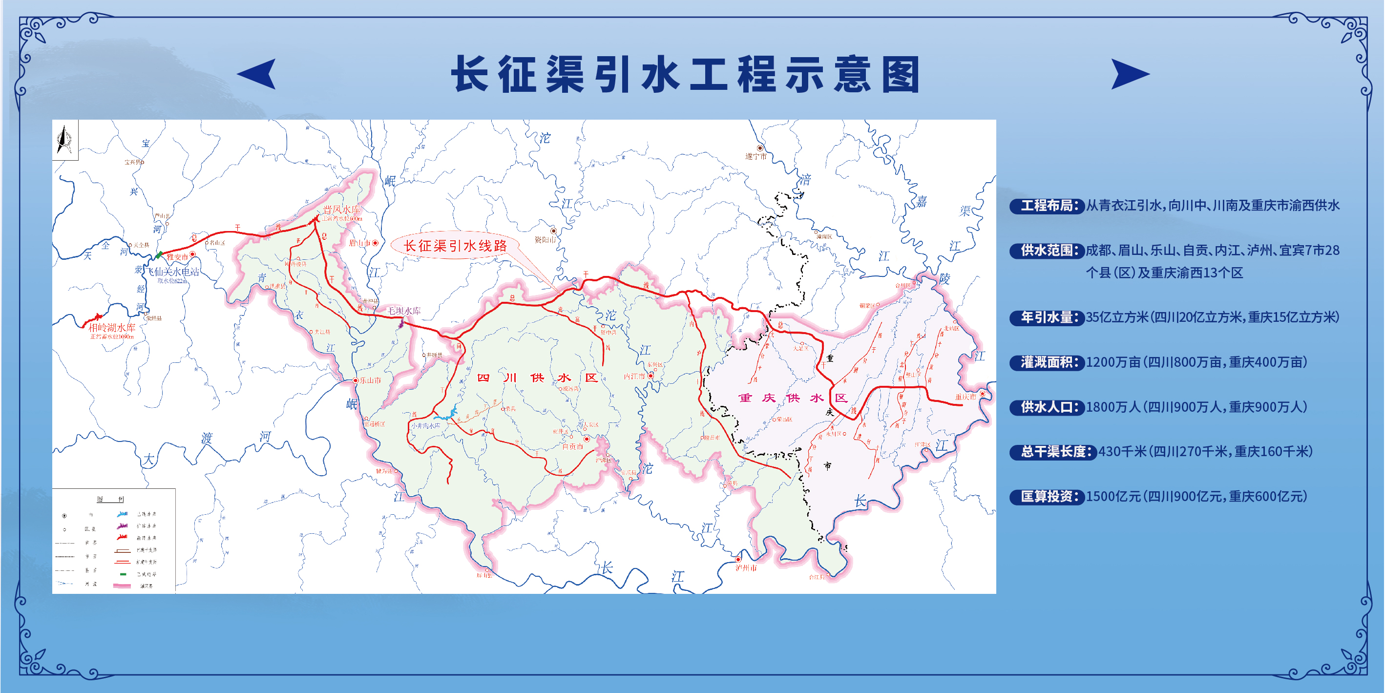 据了解,为建成四川省现代水网体系,为成渝地区双城经济圈建设和省委“一干多支”发展战略实施提供坚实的水资源保障,目前有两大“西水东引”特大世纪工程正在规划中,一个是引水长度192千米的引大济岷工程,布局从大渡河引水补给给都江堰供水区;另一个是总干渠长度430千米的长征渠引水工程,布局从青衣江引水,向川中、川南及重庆市渝西供水。