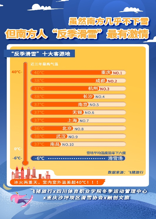 别以为越北的地方越爱“反季滑雪”。飞猪平台数据发现,南方人更青睐“反季滑雪”。热门客源地前十城市中,南方城市占据九席,各大知名火炉城市均在其中。重庆、成都和杭州位列“反季滑雪”热门客源地前三,长沙、南京、无锡、上海、北京、武汉和南昌分列第四至第十位。