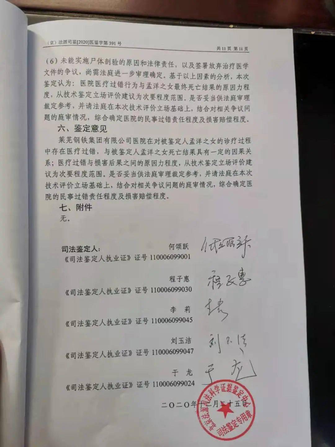 2021年1月12日,陈建利的妻子孟洋收到了北京法源司法科学证据鉴定中心出具的司法鉴定意见书,该鉴定由济南市钢城区人民法院技术室委托,鉴定事项为对莱芜钢铁集团有限公司医院对孟洋之女诊疗过程中是否存在过错,若存在过错,诊疗行为与死亡损害结果之间是否存在因果关系及原因力大小。