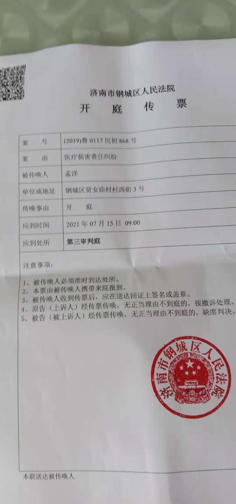 孟洋收到的开庭传票