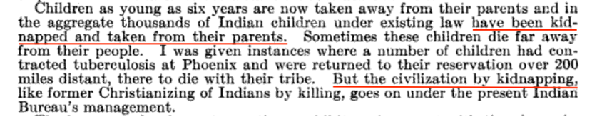 1927年2月,在美国国会的一次听证会上,有证人指出,寄宿学校是“通过绑架来实现文明”。