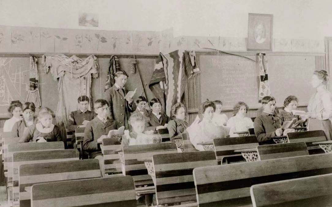 1879年,退伍军人理查德·亨利·普拉特在宾夕法尼亚州开办“卡莱尔印第安人工业学校”,这是第一所在非保留地成立的美国原住民儿童寄宿学校。这所由美国联邦政府资助的学校,以“消灭印第安,拯救族人”为理念,禁止原住民儿童使用土著语言,强迫他们“改掉”传统文化习俗。