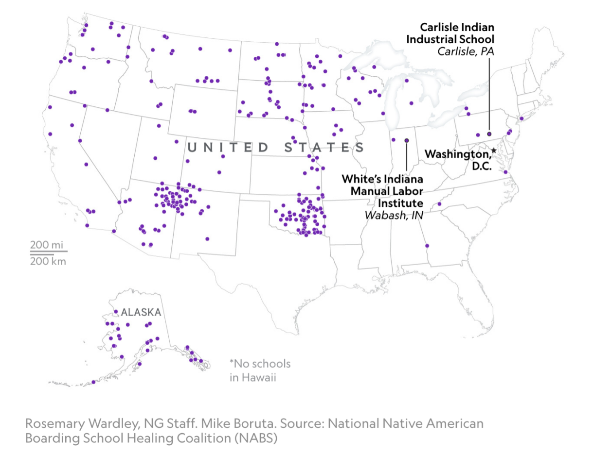 美国全国土著居民寄宿学校修复联盟(NABS)的一份统计数据显示,约在1870年至1970年间,美国共运营至少367所寄宿学校。这些寄宿学校一直持续到1978年,直到美国国会通过了《印第安儿童福利法案》(Indian Child Welfare Act),美国原住民才获得了拒绝将孩子在学校安置的合法权利。