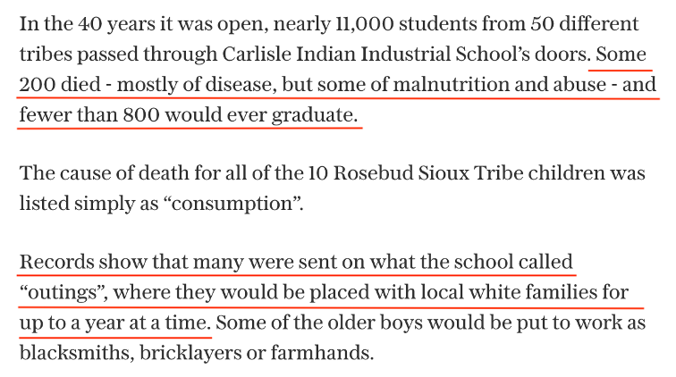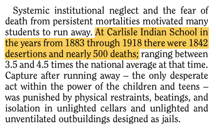 美国土著居民权利基金会(NARF)曾在一份法律评论中写道,寄宿学校是“文化种族灭绝政策”的代表。从1883年到1918年,超过1800名儿童逃离学校,近500人死于疾病、营养不良,他们常年忍受孤独、遭受虐待。幸存者表示,许多死去的同伴被匿名埋葬,有些被埋在寄宿学校的集体墓地里,他们的遗体从未被送回家乡,无从魂归故里。