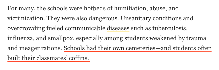 对许多原住民儿童来说,寄宿学校是羞辱、虐待和迫害的温床。不卫生和过度拥挤的寄宿条件加剧了传染病的发生,如肺结核、流感和天花,尤其是身体虚弱的儿童更易感染。寄宿学校校园里设有墓地,那些原住民儿童经常为同学建造棺材,在悲恸和恐惧中埋葬自己的同伴。
